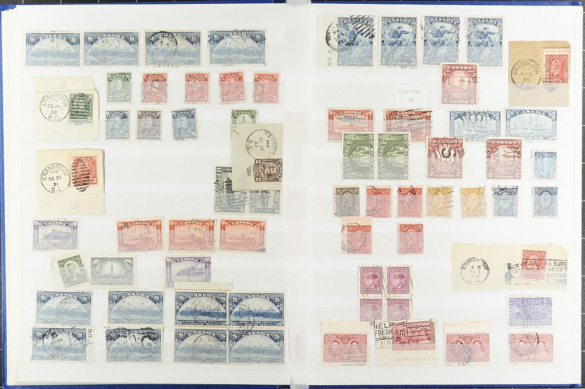 Accumulation of many thousands of used stamps filling a bankers box in a variety of formats, 1870's-1980's. The lot contains 4 red boxes with lids, with a few thousand 102 cards, generally ranging from Scott #25/560 (majority 1940s onwards, did spot 10c Small Queen (x3)), stockbook of used from the Small Queens up to the 1960's (noted a used 50c Bluenose), album pages, and loose material. A nice lot with possible finds for the dedicated collector, including "socked on the nose" town postmarks. A good winter project, overall fine to very fine. Estimate =