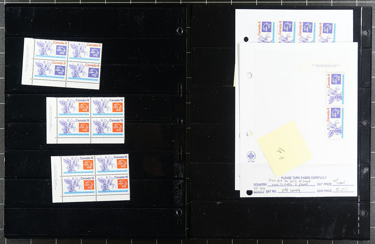 Specialized holding, partially on exhibit pages in a small binder of the 1974 UPU Centenary (Universal Postal Union) 8c / 15c values. A lovely holding of mint never hinged, including singles, plate blocks, florescence, "Red Streak" variety, "Ghost Print" and then a wild-ride of small varieties ("fly specks") all identified and illustrated. The back end of the binder contains a couple sheets, plus various singles and multiples "in process" or "working stock". A very interesting assembly. Estimate =