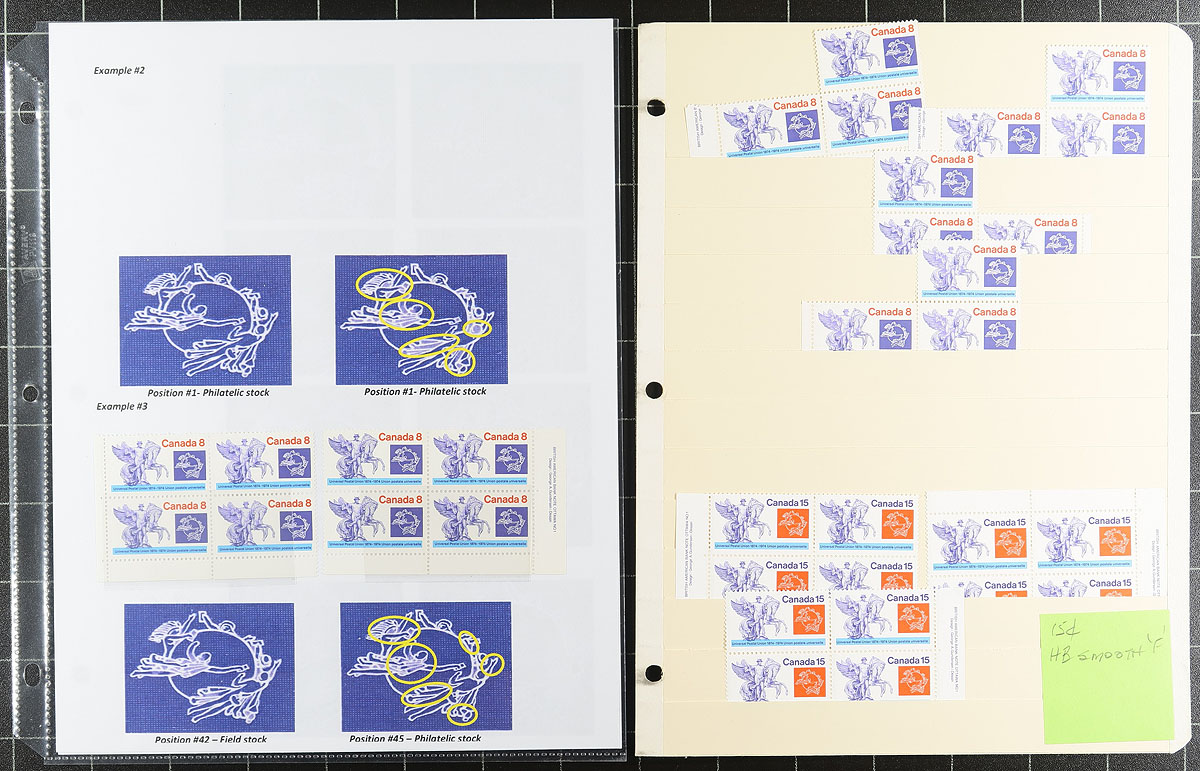 Specialized holding, partially on exhibit pages in a small binder of the 1974 UPU Centenary (Universal Postal Union) 8c / 15c values. A lovely holding of mint never hinged, including singles, plate blocks, florescence, "Red Streak" variety, "Ghost Print" and then a wild-ride of small varieties ("fly specks") all identified and illustrated. The back end of the binder contains a couple sheets, plus various singles and multiples "in process" or "working stock". A very interesting assembly. Estimate =