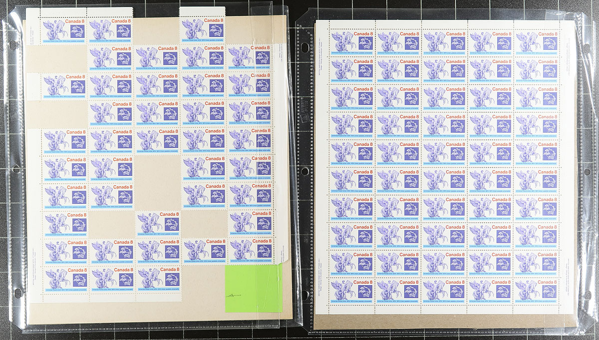 Specialized holding, partially on exhibit pages in a small binder of the 1974 UPU Centenary (Universal Postal Union) 8c / 15c values. A lovely holding of mint never hinged, including singles, plate blocks, florescence, "Red Streak" variety, "Ghost Print" and then a wild-ride of small varieties ("fly specks") all identified and illustrated. The back end of the binder contains a couple sheets, plus various singles and multiples "in process" or "working stock". A very interesting assembly. Estimate =