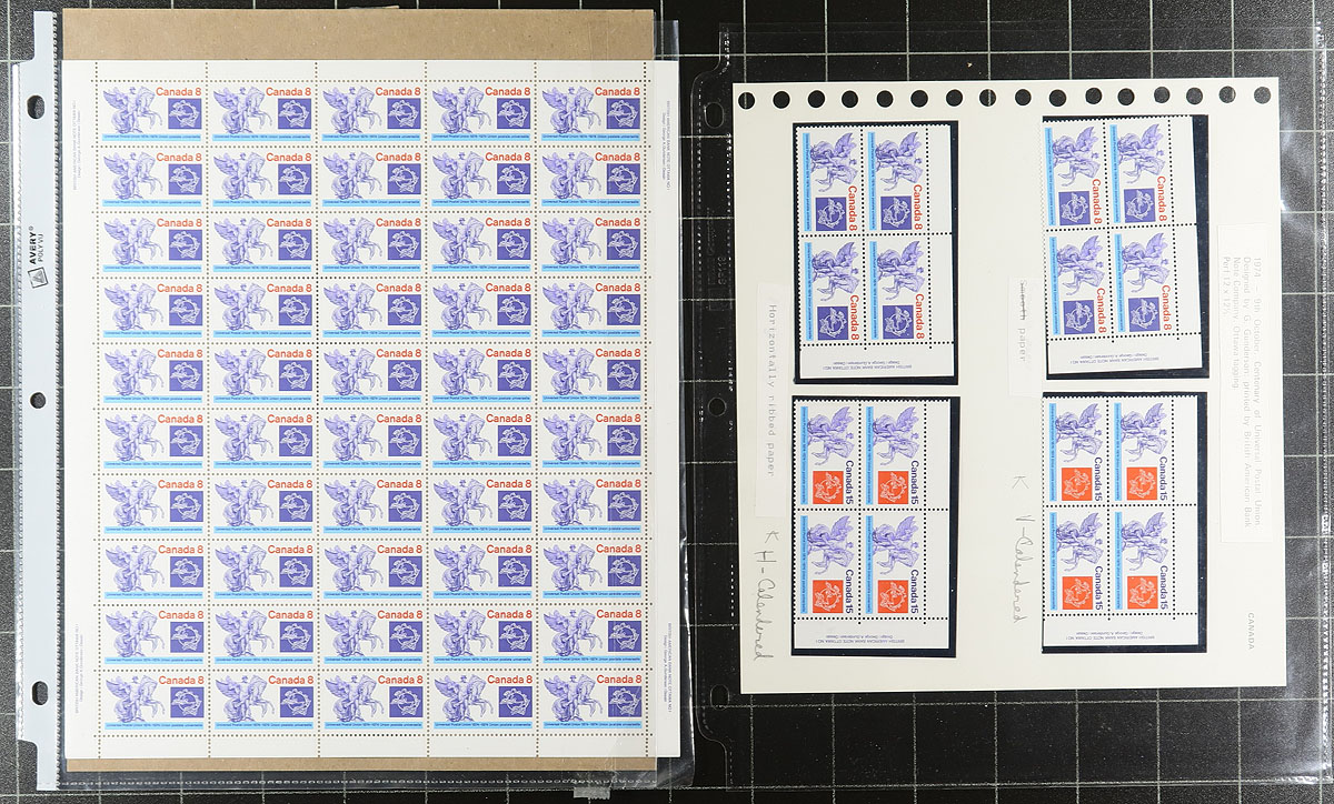 Specialized holding, partially on exhibit pages in a small binder of the 1974 UPU Centenary (Universal Postal Union) 8c / 15c values. A lovely holding of mint never hinged, including singles, plate blocks, florescence, "Red Streak" variety, "Ghost Print" and then a wild-ride of small varieties ("fly specks") all identified and illustrated. The back end of the binder contains a couple sheets, plus various singles and multiples "in process" or "working stock". A very interesting assembly. Estimate =