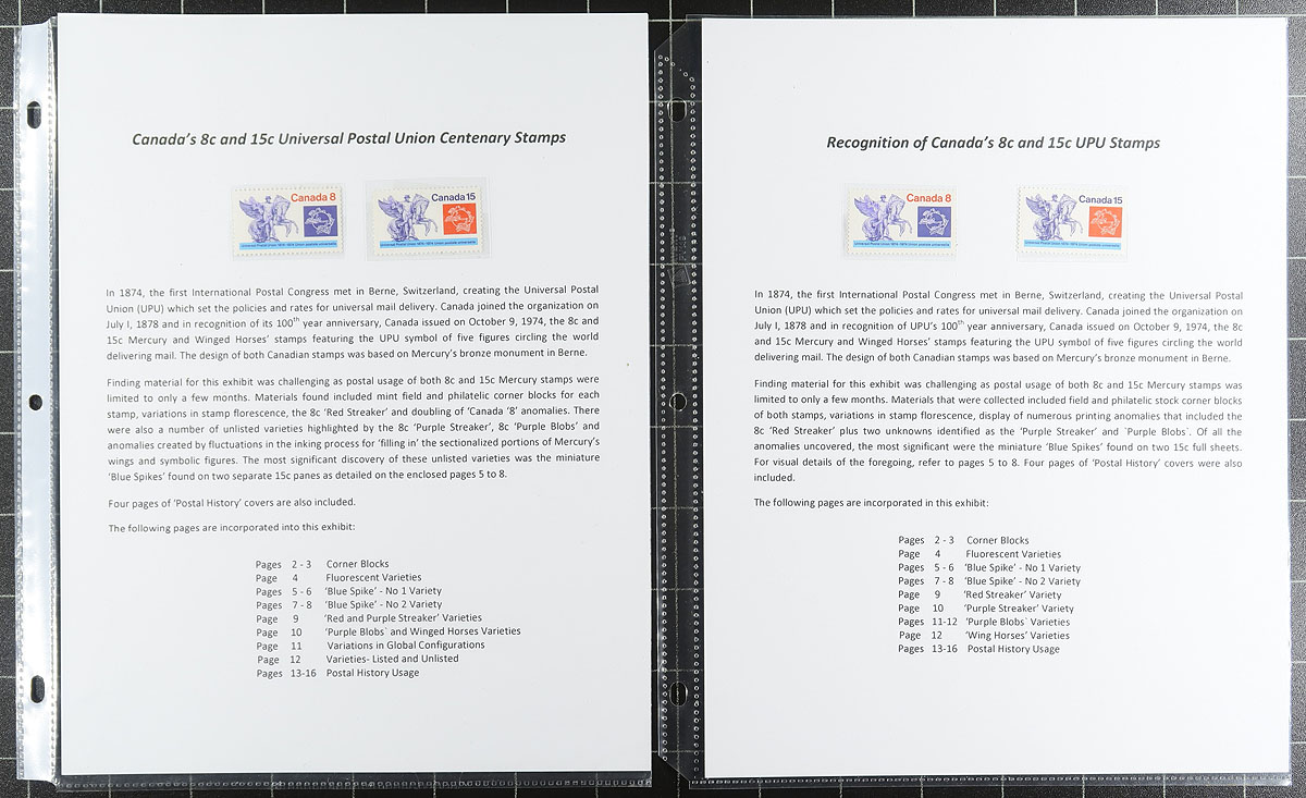 Specialized holding, partially on exhibit pages in a small binder of the 1974 UPU Centenary (Universal Postal Union) 8c / 15c values. A lovely holding of mint never hinged, including singles, plate blocks, florescence, "Red Streak" variety, "Ghost Print" and then a wild-ride of small varieties ("fly specks") all identified and illustrated. The back end of the binder contains a couple sheets, plus various singles and multiples "in process" or "working stock". A very interesting assembly. Estimate =