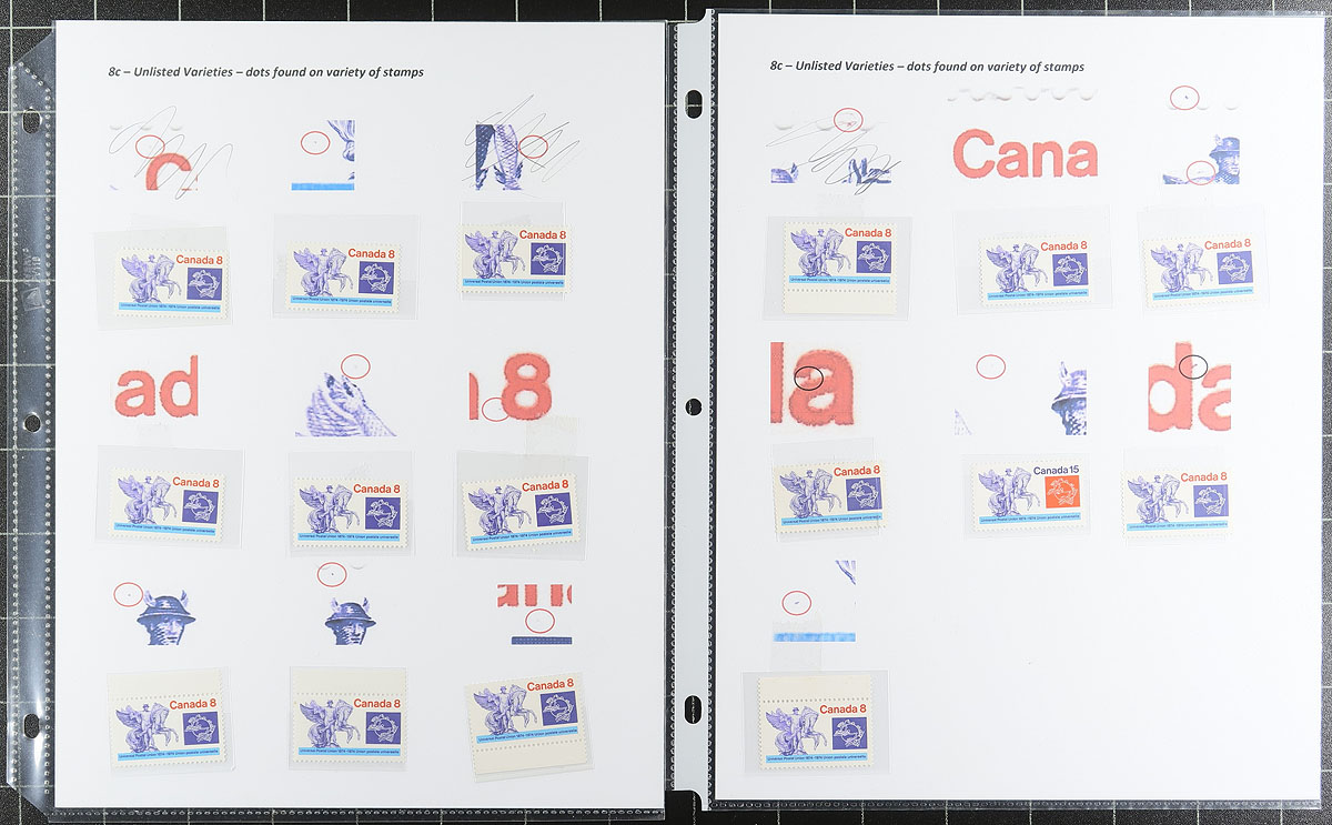 Specialized holding, partially on exhibit pages in a small binder of the 1974 UPU Centenary (Universal Postal Union) 8c / 15c values. A lovely holding of mint never hinged, including singles, plate blocks, florescence, "Red Streak" variety, "Ghost Print" and then a wild-ride of small varieties ("fly specks") all identified and illustrated. The back end of the binder contains a couple sheets, plus various singles and multiples "in process" or "working stock". A very interesting assembly. Estimate =