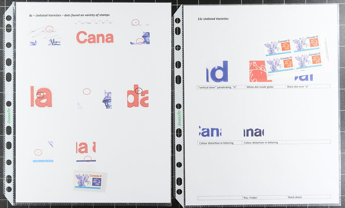 Specialized holding, partially on exhibit pages in a small binder of the 1974 UPU Centenary (Universal Postal Union) 8c / 15c values. A lovely holding of mint never hinged, including singles, plate blocks, florescence, "Red Streak" variety, "Ghost Print" and then a wild-ride of small varieties ("fly specks") all identified and illustrated. The back end of the binder contains a couple sheets, plus various singles and multiples "in process" or "working stock". A very interesting assembly. Estimate =