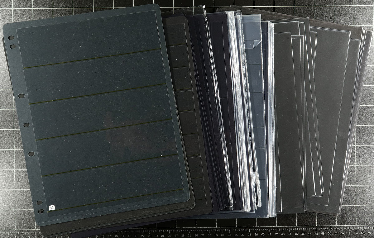 Accumulation of Vario-style or Hagner style stock pages in 6 binders and loose pages in a bankers box. Almost all the pages are double-sided and only a few not 3-hole punched for easy storage noting: single page (x30, ideal for souvenir sheets), large single page (x30), 2-row (x85, ideal for covers), 3-row (x13), 4-row (x13), 4-line (x40, ideal for blocks), along with 40 additional pages with a variety of configurations. Mostly in gently used condition and still useful for all collectors. Original retail price would be several hundreds of dollars. Estimate =