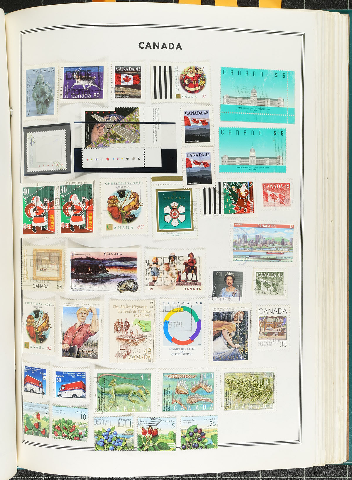 Collection of primarily used Canada in a Harris album, 1859-1990's, containing several hundreds of stamps, generally ranging from Scott #19/1613, along with selections of back of the back and BNA material. The collection essentially begins with 25 Small Queens (noting 10c (x2), and 50c Widow Weeds), low denomination Jubilees, part sets of Leafs, Quebecs, Edwards, with complete sets of Numerals, Admirals, Scrolls, up to the War issues. The collection also includes a few mint stamps including #s 120 (mh, c.v. $70), 198 (nh, $90), E1 (mh, $180), along with used stamps cataloguing $10 and up including #123-124 coil singles, 50c Bluenose, and more. A nice collection that holds a few surprises, and should be continued until completion. A few small faults with a few of the early issues, with online photos showing several pages, overall fine to very fine. Estimate =