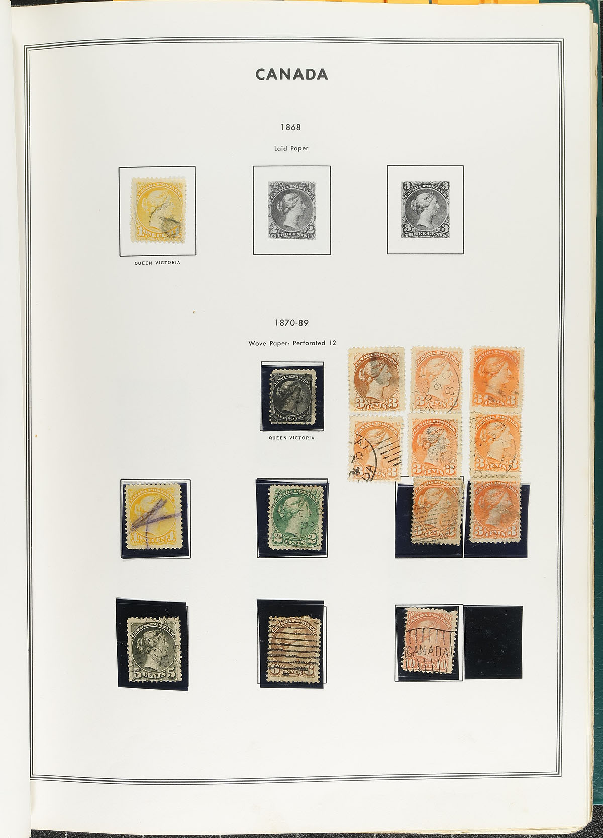 Collection of primarily used Canada in a Harris album, 1859-1990's, containing several hundreds of stamps, generally ranging from Scott #19/1613, along with selections of back of the back and BNA material. The collection essentially begins with 25 Small Queens (noting 10c (x2), and 50c Widow Weeds), low denomination Jubilees, part sets of Leafs, Quebecs, Edwards, with complete sets of Numerals, Admirals, Scrolls, up to the War issues. The collection also includes a few mint stamps including #s 120 (mh, c.v. $70), 198 (nh, $90), E1 (mh, $180), along with used stamps cataloguing $10 and up including #123-124 coil singles, 50c Bluenose, and more. A nice collection that holds a few surprises, and should be continued until completion. A few small faults with a few of the early issues, with online photos showing several pages, overall fine to very fine. Estimate =