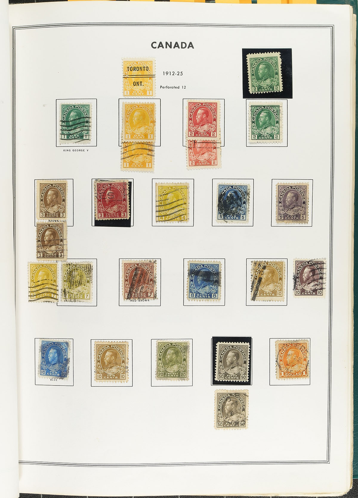 Collection of primarily used Canada in a Harris album, 1859-1990's, containing several hundreds of stamps, generally ranging from Scott #19/1613, along with selections of back of the back and BNA material. The collection essentially begins with 25 Small Queens (noting 10c (x2), and 50c Widow Weeds), low denomination Jubilees, part sets of Leafs, Quebecs, Edwards, with complete sets of Numerals, Admirals, Scrolls, up to the War issues. The collection also includes a few mint stamps including #s 120 (mh, c.v. $70), 198 (nh, $90), E1 (mh, $180), along with used stamps cataloguing $10 and up including #123-124 coil singles, 50c Bluenose, and more. A nice collection that holds a few surprises, and should be continued until completion. A few small faults with a few of the early issues, with online photos showing several pages, overall fine to very fine. Estimate =