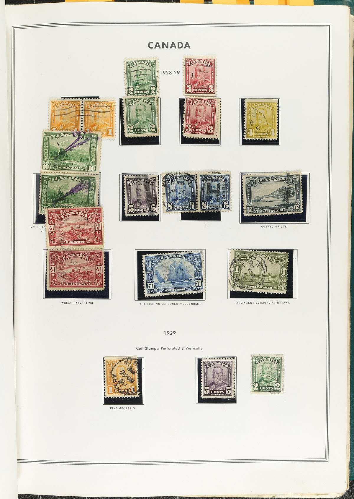 Collection of primarily used Canada in a Harris album, 1859-1990's, containing several hundreds of stamps, generally ranging from Scott #19/1613, along with selections of back of the back and BNA material. The collection essentially begins with 25 Small Queens (noting 10c (x2), and 50c Widow Weeds), low denomination Jubilees, part sets of Leafs, Quebecs, Edwards, with complete sets of Numerals, Admirals, Scrolls, up to the War issues. The collection also includes a few mint stamps including #s 120 (mh, c.v. $70), 198 (nh, $90), E1 (mh, $180), along with used stamps cataloguing $10 and up including #123-124 coil singles, 50c Bluenose, and more. A nice collection that holds a few surprises, and should be continued until completion. A few small faults with a few of the early issues, with online photos showing several pages, overall fine to very fine. Estimate =