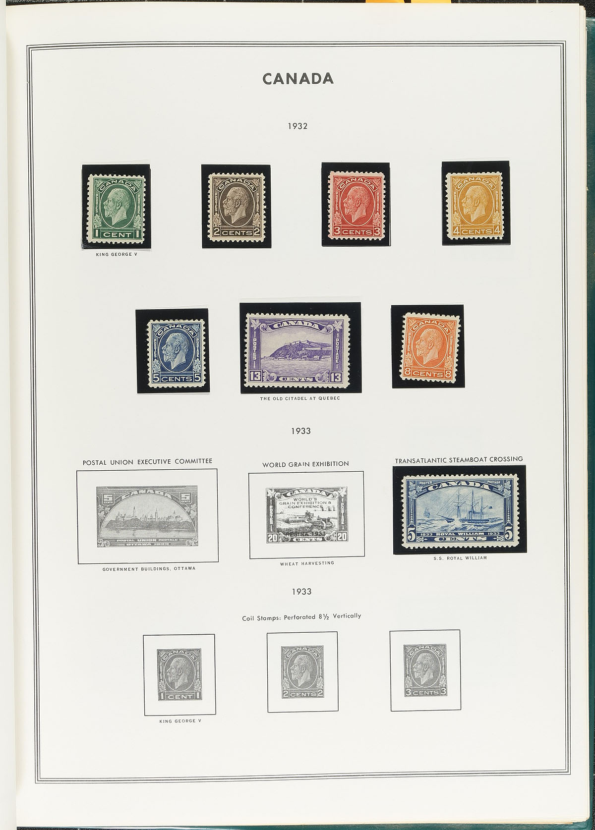 Very nice collection of primarily mint Canada in a Harris album, 1870's-1970's, containing a few hundred stamps neatly organized in hingeless mounts. The collection generally ranges from Scott #36/601, including better stamps with Scott #s 36-37 (mh, c.v. $245 total), mint Jubilees (1c-6c, 20c, all with a few gum issues), used Jubilees (8c, 50c, c.v. $245 total), complete set of Quebecs (used and no gum stamps), $1 Admiral (mh, $85), part mint and used sets of Scrolls and Arch issues, and complete mint sets of Medallion and 1935 Pictorial issues. A nice start to a mint collection, noting a mixture of mint hinged and no gum issues pre-1930's, and hinged and a few never hinged thereafter, overall fine to very fine. Estimate =