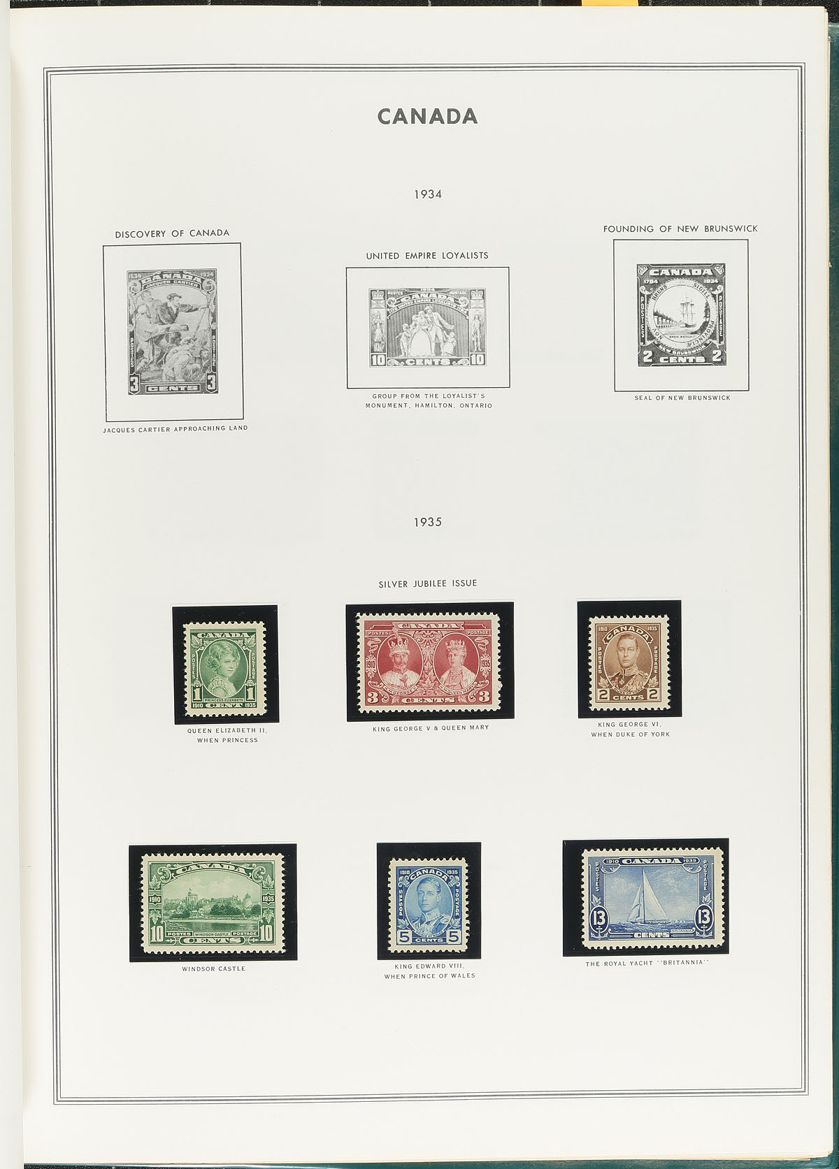 Very nice collection of primarily mint Canada in a Harris album, 1870's-1970's, containing a few hundred stamps neatly organized in hingeless mounts. The collection generally ranges from Scott #36/601, including better stamps with Scott #s 36-37 (mh, c.v. $245 total), mint Jubilees (1c-6c, 20c, all with a few gum issues), used Jubilees (8c, 50c, c.v. $245 total), complete set of Quebecs (used and no gum stamps), $1 Admiral (mh, $85), part mint and used sets of Scrolls and Arch issues, and complete mint sets of Medallion and 1935 Pictorial issues. A nice start to a mint collection, noting a mixture of mint hinged and no gum issues pre-1930's, and hinged and a few never hinged thereafter, overall fine to very fine. Estimate =