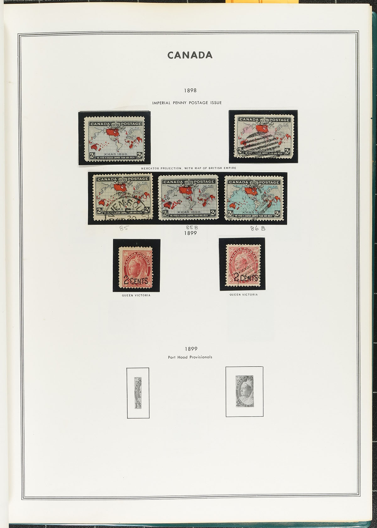 Very nice collection of primarily mint Canada in a Harris album, 1870's-1970's, containing a few hundred stamps neatly organized in hingeless mounts. The collection generally ranges from Scott #36/601, including better stamps with Scott #s 36-37 (mh, c.v. $245 total), mint Jubilees (1c-6c, 20c, all with a few gum issues), used Jubilees (8c, 50c, c.v. $245 total), complete set of Quebecs (used and no gum stamps), $1 Admiral (mh, $85), part mint and used sets of Scrolls and Arch issues, and complete mint sets of Medallion and 1935 Pictorial issues. A nice start to a mint collection, noting a mixture of mint hinged and no gum issues pre-1930's, and hinged and a few never hinged thereafter, overall fine to very fine. Estimate =