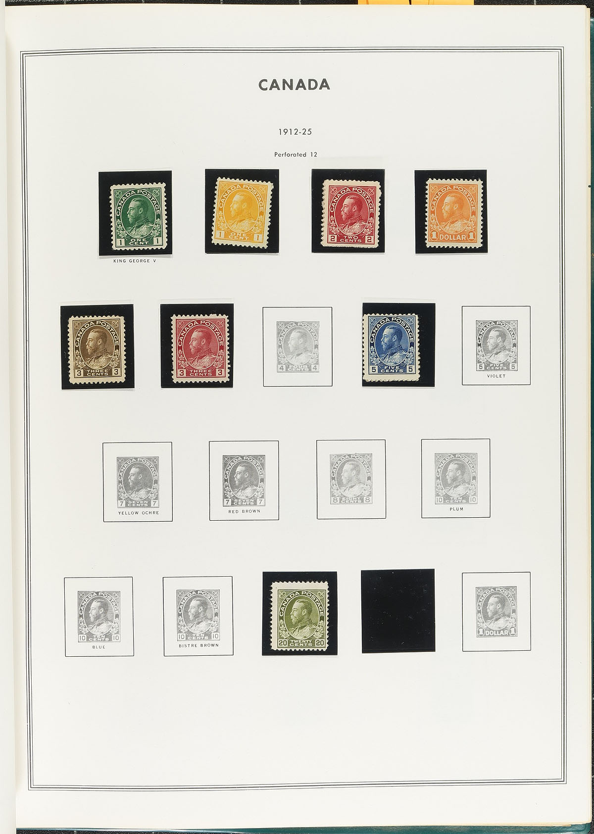 Very nice collection of primarily mint Canada in a Harris album, 1870's-1970's, containing a few hundred stamps neatly organized in hingeless mounts. The collection generally ranges from Scott #36/601, including better stamps with Scott #s 36-37 (mh, c.v. $245 total), mint Jubilees (1c-6c, 20c, all with a few gum issues), used Jubilees (8c, 50c, c.v. $245 total), complete set of Quebecs (used and no gum stamps), $1 Admiral (mh, $85), part mint and used sets of Scrolls and Arch issues, and complete mint sets of Medallion and 1935 Pictorial issues. A nice start to a mint collection, noting a mixture of mint hinged and no gum issues pre-1930's, and hinged and a few never hinged thereafter, overall fine to very fine. Estimate =