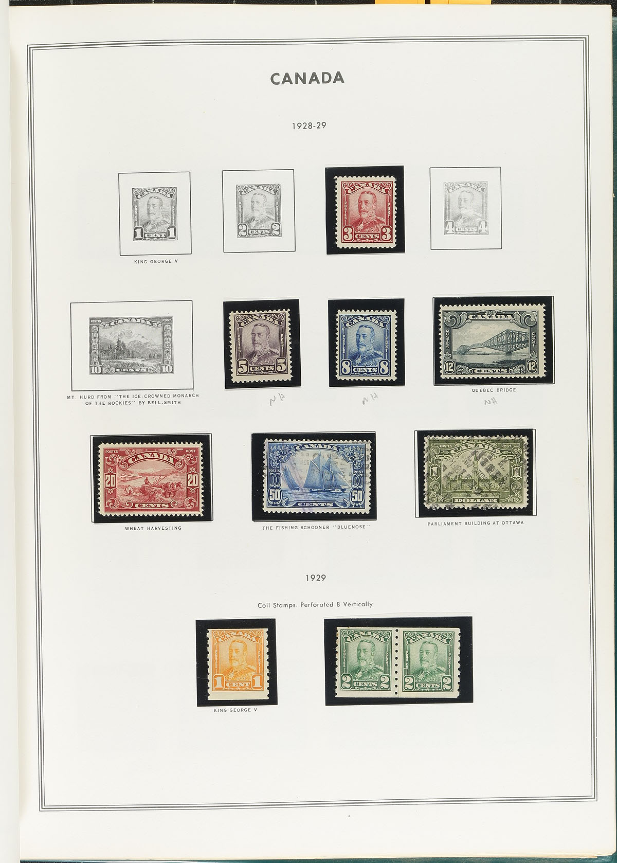 Very nice collection of primarily mint Canada in a Harris album, 1870's-1970's, containing a few hundred stamps neatly organized in hingeless mounts. The collection generally ranges from Scott #36/601, including better stamps with Scott #s 36-37 (mh, c.v. $245 total), mint Jubilees (1c-6c, 20c, all with a few gum issues), used Jubilees (8c, 50c, c.v. $245 total), complete set of Quebecs (used and no gum stamps), $1 Admiral (mh, $85), part mint and used sets of Scrolls and Arch issues, and complete mint sets of Medallion and 1935 Pictorial issues. A nice start to a mint collection, noting a mixture of mint hinged and no gum issues pre-1930's, and hinged and a few never hinged thereafter, overall fine to very fine. Estimate =