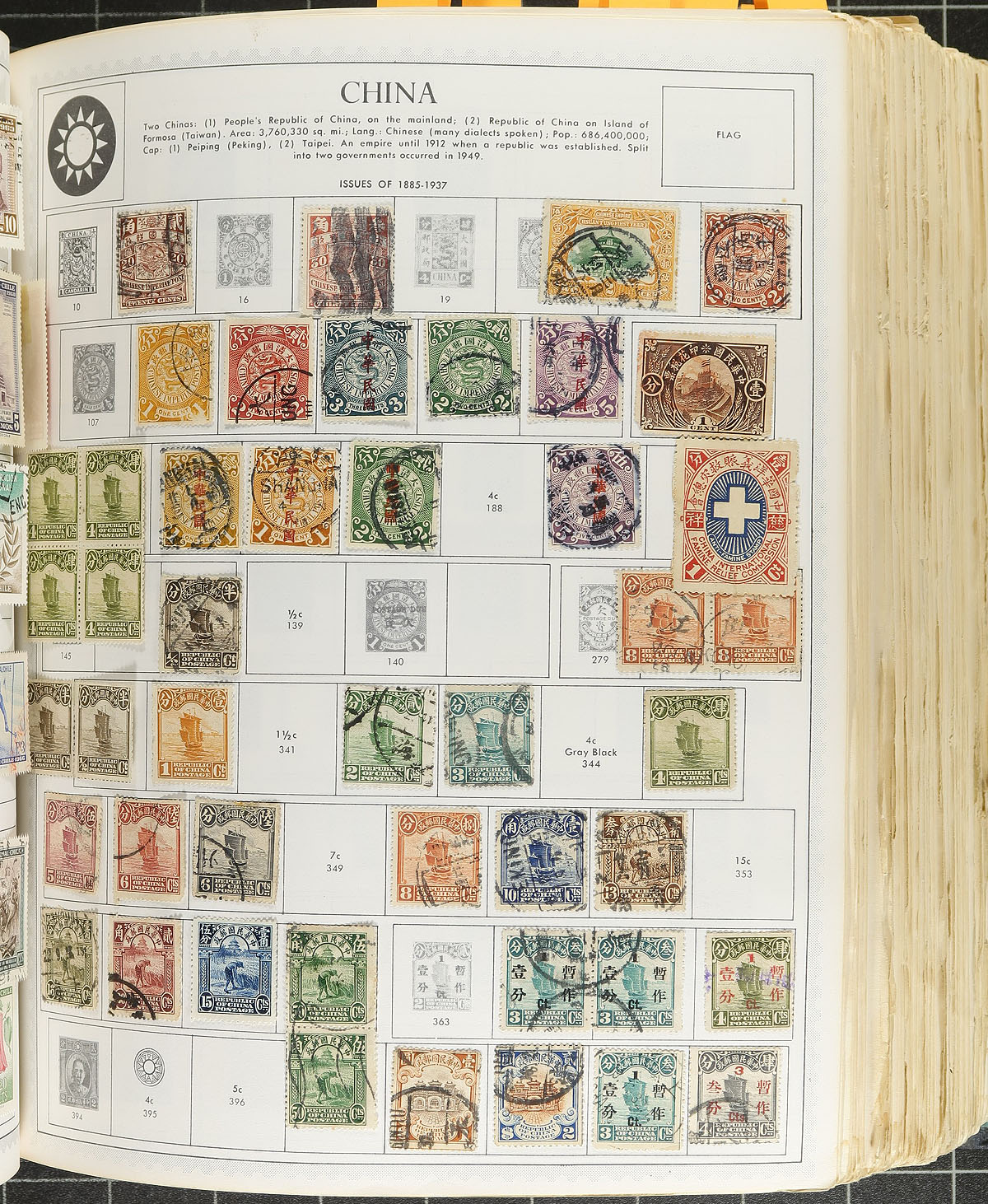 Massive worldwide collection in an overwhelming Minkus Master Global Album and a Harris Senior Statesman Album, 1860's-1970's. The albums most likely contain 20,000 primarily used stamps, covering countries from A to Z, with better representation from European countries, namely France and Colonies, Austria, Germany and States, Belgium, and much more, China, United States, India and States, British Commonwealth areas, and so much more, including back of the book issues for some countries (railway stamps, newspaper stamps, occupations, etc.). The bulk of the value is in the Minkus album, as the stamps range from the 1860's to the early 1960's, with the Statesman album covers years from the 1960's to the 1970's, with a spot check indicating singles and sets cataloguing $10 and up. Postmark interest includes cds, numeral, and other types, noting several "socked on the nose" town cancels. An ideal lot for the worldwide collector, with online photos showing a sampling, overall fine to very fine. Offered as received, one collector's lifetime holding. Estimate =