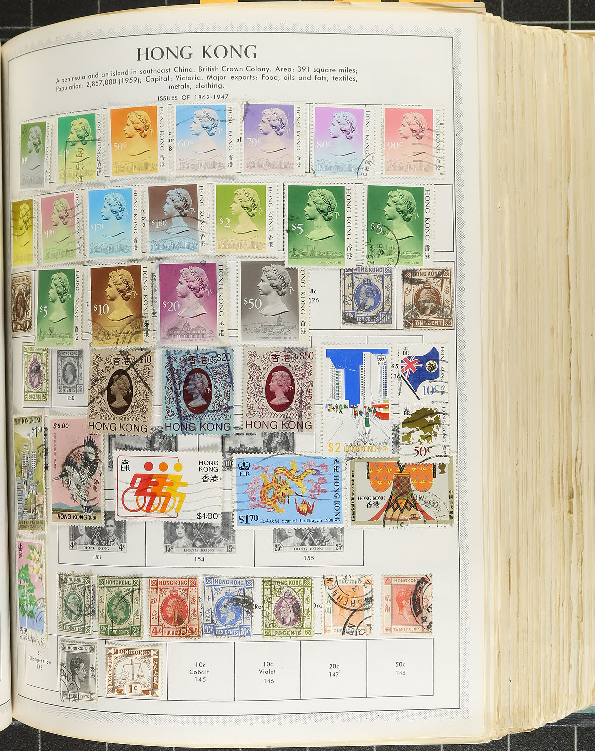 Massive worldwide collection in an overwhelming Minkus Master Global Album and a Harris Senior Statesman Album, 1860's-1970's. The albums most likely contain 20,000 primarily used stamps, covering countries from A to Z, with better representation from European countries, namely France and Colonies, Austria, Germany and States, Belgium, and much more, China, United States, India and States, British Commonwealth areas, and so much more, including back of the book issues for some countries (railway stamps, newspaper stamps, occupations, etc.). The bulk of the value is in the Minkus album, as the stamps range from the 1860's to the early 1960's, with the Statesman album covers years from the 1960's to the 1970's, with a spot check indicating singles and sets cataloguing $10 and up. Postmark interest includes cds, numeral, and other types, noting several "socked on the nose" town cancels. An ideal lot for the worldwide collector, with online photos showing a sampling, overall fine to very fine. Offered as received, one collector's lifetime holding. Estimate =