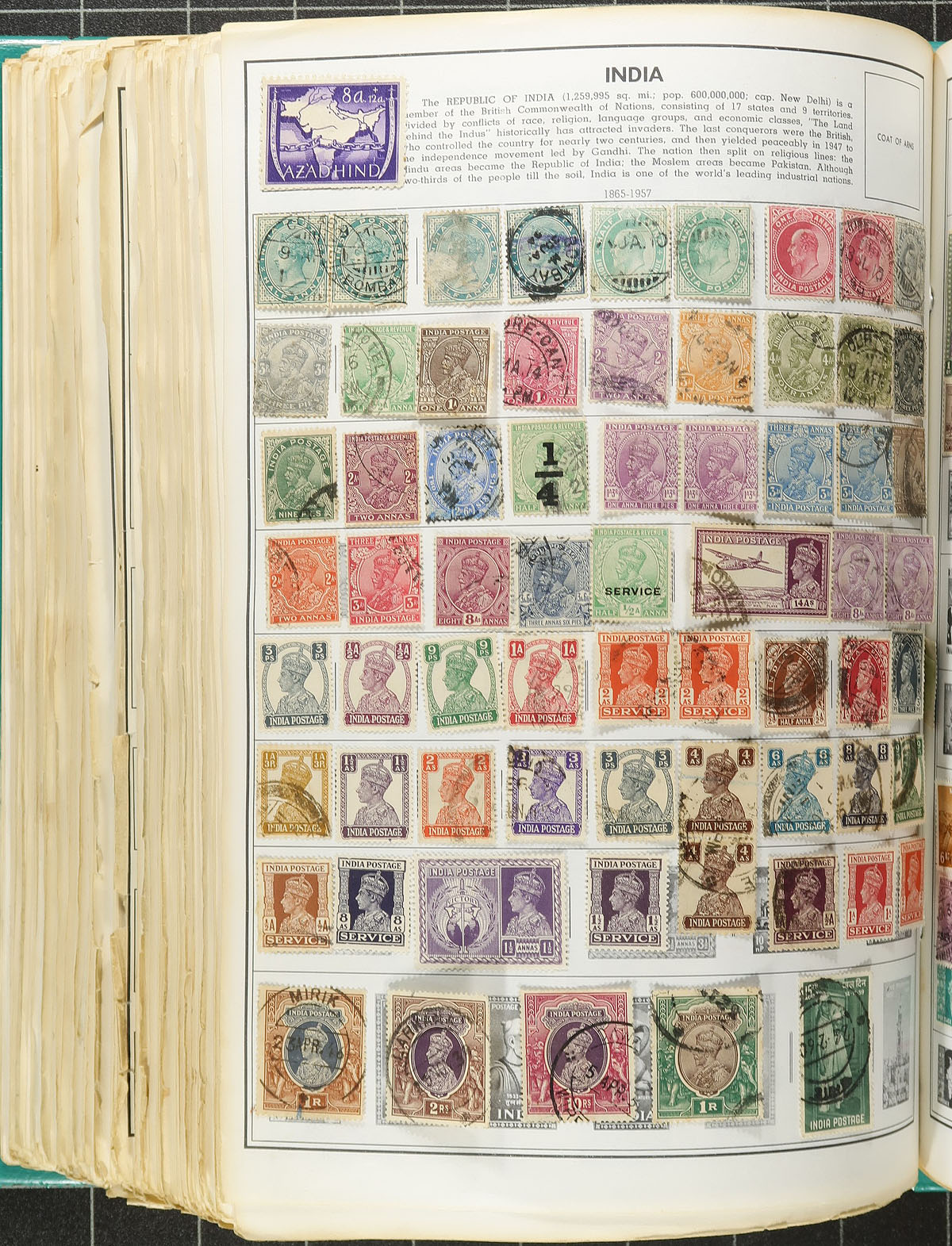 Massive worldwide collection in an overwhelming Minkus Master Global Album and a Harris Senior Statesman Album, 1860's-1970's. The albums most likely contain 20,000 primarily used stamps, covering countries from A to Z, with better representation from European countries, namely France and Colonies, Austria, Germany and States, Belgium, and much more, China, United States, India and States, British Commonwealth areas, and so much more, including back of the book issues for some countries (railway stamps, newspaper stamps, occupations, etc.). The bulk of the value is in the Minkus album, as the stamps range from the 1860's to the early 1960's, with the Statesman album covers years from the 1960's to the 1970's, with a spot check indicating singles and sets cataloguing $10 and up. Postmark interest includes cds, numeral, and other types, noting several "socked on the nose" town cancels. An ideal lot for the worldwide collector, with online photos showing a sampling, overall fine to very fine. Offered as received, one collector's lifetime holding. Estimate =