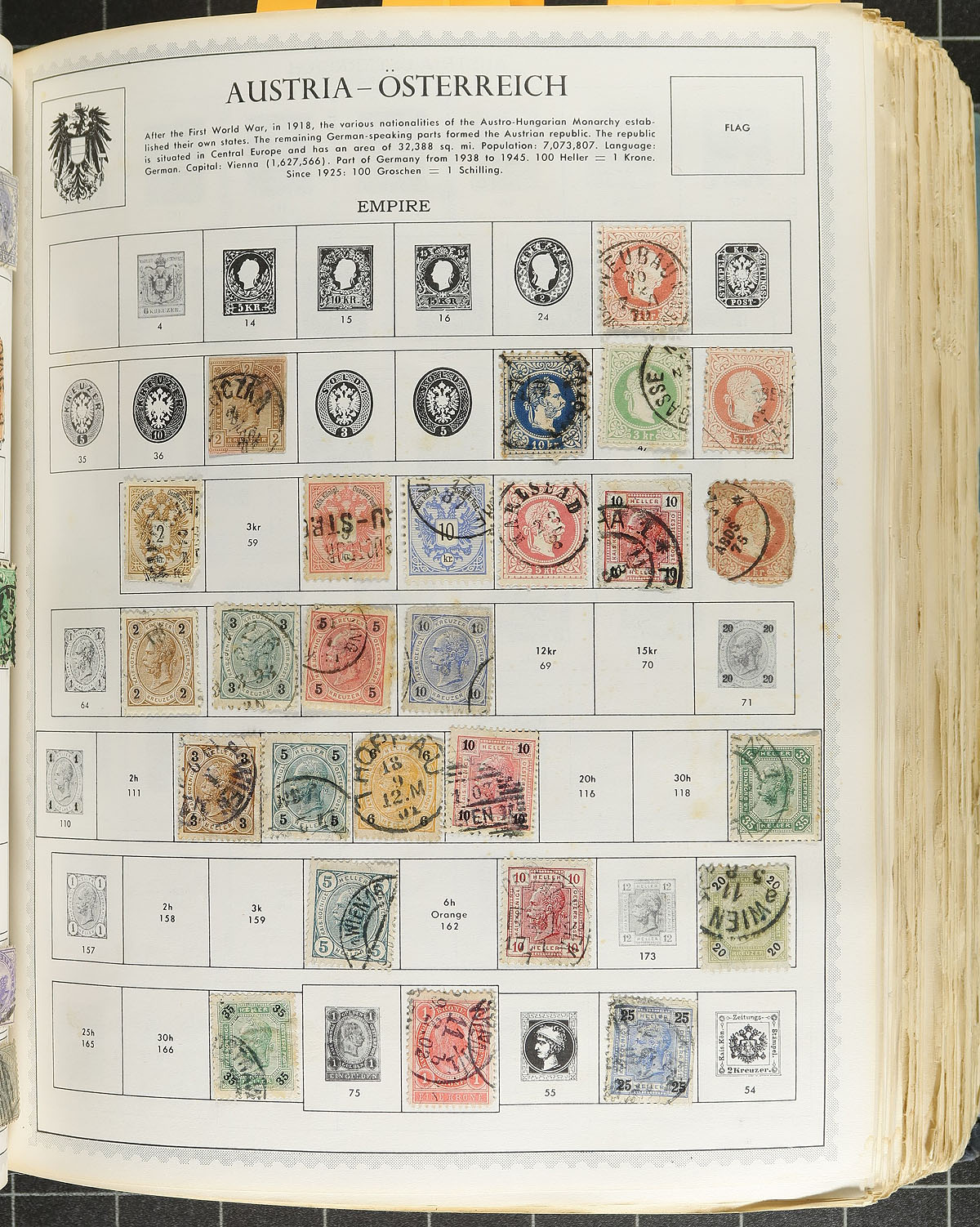Massive worldwide collection in an overwhelming Minkus Master Global Album and a Harris Senior Statesman Album, 1860's-1970's. The albums most likely contain 20,000 primarily used stamps, covering countries from A to Z, with better representation from European countries, namely France and Colonies, Austria, Germany and States, Belgium, and much more, China, United States, India and States, British Commonwealth areas, and so much more, including back of the book issues for some countries (railway stamps, newspaper stamps, occupations, etc.). The bulk of the value is in the Minkus album, as the stamps range from the 1860's to the early 1960's, with the Statesman album covers years from the 1960's to the 1970's, with a spot check indicating singles and sets cataloguing $10 and up. Postmark interest includes cds, numeral, and other types, noting several "socked on the nose" town cancels. An ideal lot for the worldwide collector, with online photos showing a sampling, overall fine to very fine. Offered as received, one collector's lifetime holding. Estimate =