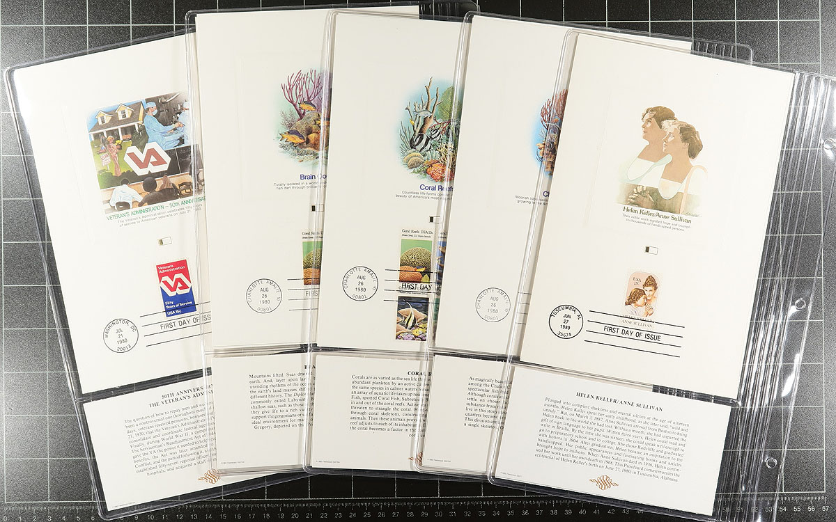 Group of 8 topical prepared collections filling a carton including an interesting "Limited Edition Collection of 1980 Olympic Miniature Sheets", "USA Legends of the West", "Stanley Gibbons Royal Wedding Stamp Album", "Proofcard Society of United States (Fleetwood)", "Golden Replicas of United States Stamps", and more. A nice lot of a few hundred covers and stamps, ideal for topical and thematic collectors. Estimate =