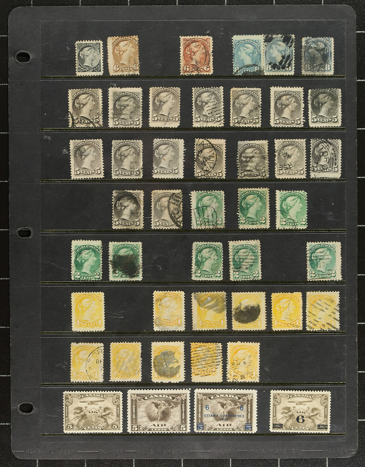 Nice accumulation of mint and used Canada, 1870's-1990's, containing several hundreds of stamps in two stockbooks and several loose stock pages. The lot contains a wide variety of items, generally ranging from Scott #34/1615, noting roughly 75 used Small Queens (including 5c (x16)), along with some useful mint material including Scott #s 149-150, 154 blocks of 4 (2mh, 2nh, c.v. $130 total), 178, 180, 182 coil pairs (mh, $67 total), 241 block of 4 (nh, $66), C1-C4 (nh, $224 total), along with used coil singles and pairs, singles, sets, and partial sets (noting a 50c Bluenose), and other items cataloguing $10 and up each. An interesting lot with suitable finds along with accumulations of Elizabethan issues, ideal for the Canada collector, overall fine to very fine. Estimate =