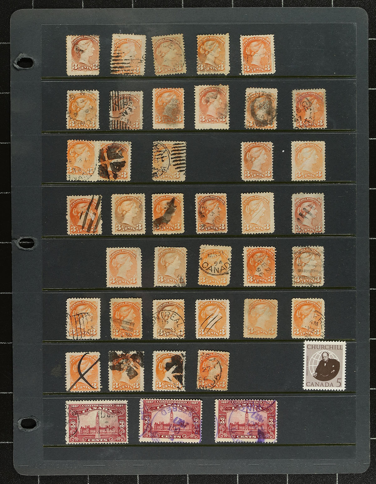 Nice accumulation of mint and used Canada, 1870's-1990's, containing several hundreds of stamps in two stockbooks and several loose stock pages. The lot contains a wide variety of items, generally ranging from Scott #34/1615, noting roughly 75 used Small Queens (including 5c (x16)), along with some useful mint material including Scott #s 149-150, 154 blocks of 4 (2mh, 2nh, c.v. $130 total), 178, 180, 182 coil pairs (mh, $67 total), 241 block of 4 (nh, $66), C1-C4 (nh, $224 total), along with used coil singles and pairs, singles, sets, and partial sets (noting a 50c Bluenose), and other items cataloguing $10 and up each. An interesting lot with suitable finds along with accumulations of Elizabethan issues, ideal for the Canada collector, overall fine to very fine. Estimate =