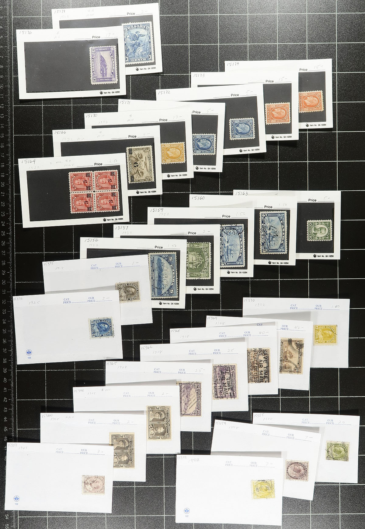 A wild-ride of "102" cards with QV to George VI era, mint and used, including "back of the book" issues. A total of 113 cards, each priced with "sale price" (note, lower than catalogue value) ranging from $1.00 to $27.00 per card. Well worth our estimated value. Estimate =