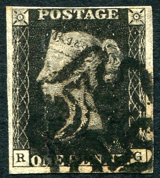 Four-margin used "Penny Black" position "B-G" with a "socked on the nose" black "Maltese Cross". A wonderfully sharp example of the world's best known stamp. Pressed out horizonal crease, but still a nice example of the world's best known stamp. 2025 Scott US$375.00 =