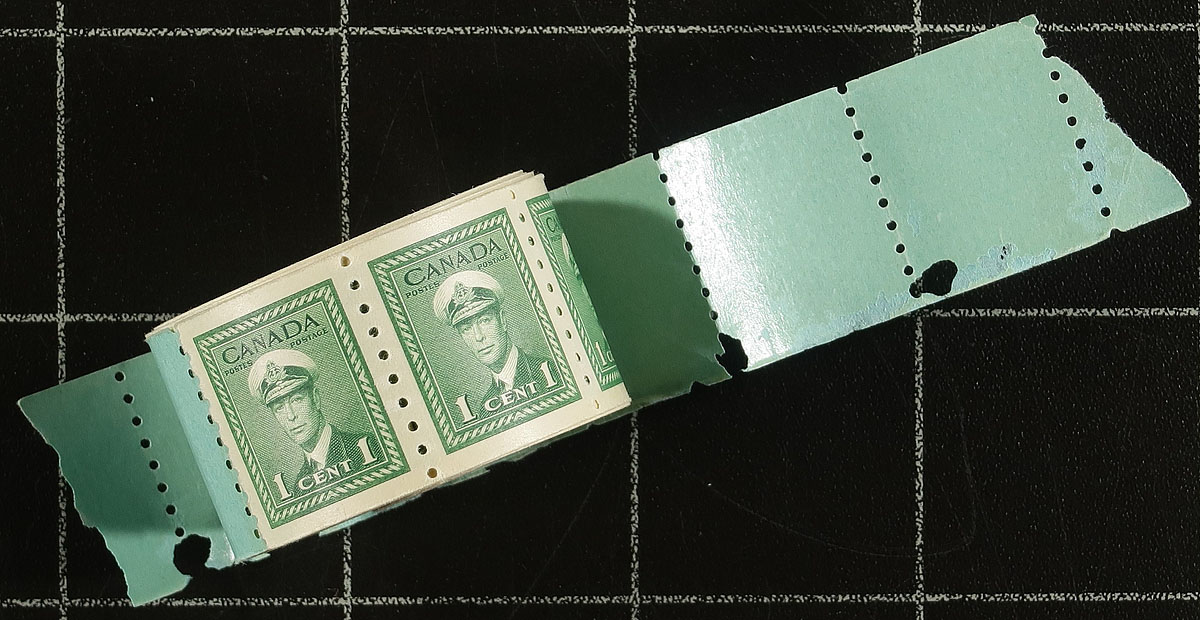 Intact (without partial /"rough" lead strip but including the end tabs) mint NH roll of 500 of the 1943 issue 1c green GeoVI "War Issue" coil (perf 8). The roll is unchecked for paste-up pairs and certainly includes jump strips. A cursory inspection of the first few dozen stamps in the roll showed them to be of very nice quality. Valued by basic Scott catalogue as 500 NH singles. 2025 Scott US$1,125.00 =