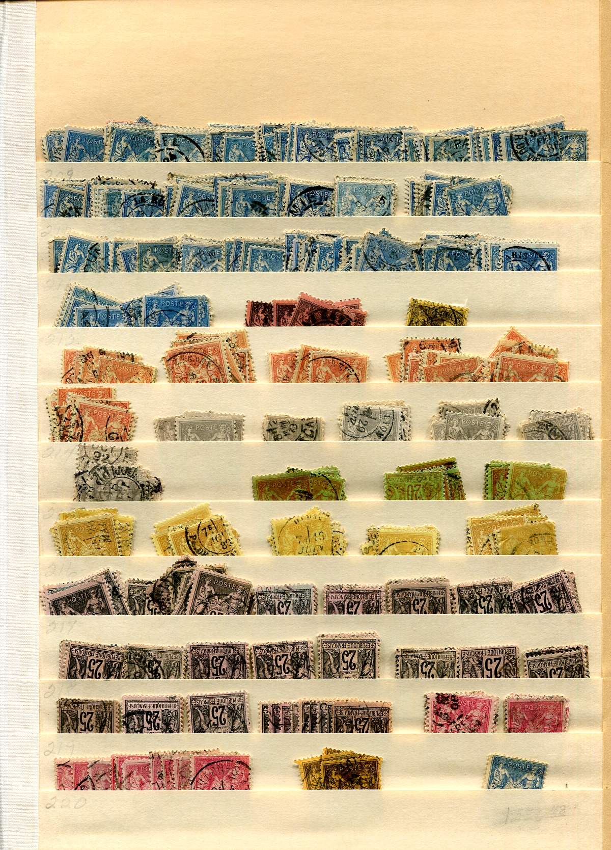 Part 2: French accumulation of used late 19th century "Peace and Commerce" (Sage type) issues on four "Elbe" stockpages. with die types, papers, lots of cancel interest, even a couple of perfins. Wide range of denominations, and many have basic catalogue values to $50.00 each, and better values are distinctly possible. At 100+ years old, expect some mixed condition. Assembled about 60 years ago, awaiting a modern treasure seeker (the collector reused these pages, ignore the easily removable pencil notations). Estimate =