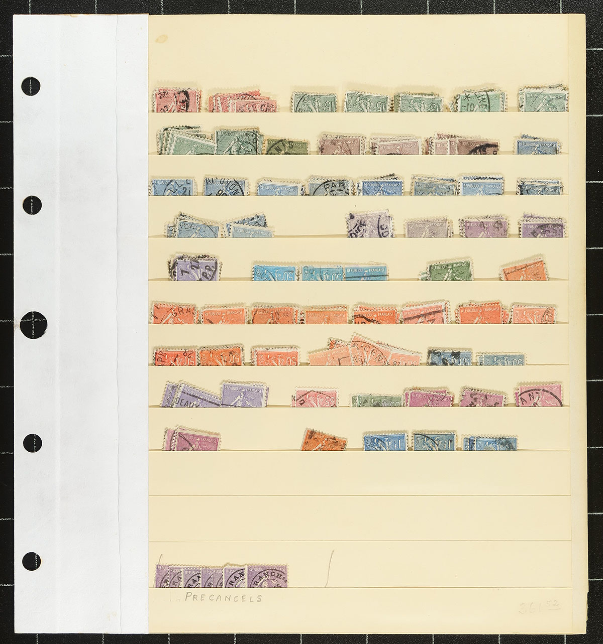 Part 3: French accumulation of used early 20th century "Liberty, Equality, Fraternity", "Rights of Man", Liberty and Peace", "Sower" and "Pasteur" issues on 6 Elbe stockpages. Wide range of denominations, and many have basic catalogue values to $20.00 each, and better values are distinctly possible. Items are often stacked five deep, meaning there is a lot more here than appears in the images. It also means we aren’t exactly sure what is here. At 100 years old, expect some mixed condition. Assembled about 60 years ago, awaiting a modern treasure seeker (the collector reused these pages, ignore the easily removable pencil notations). Estimate =