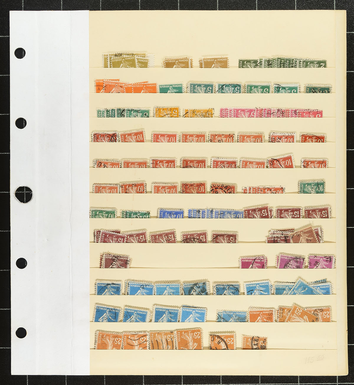 Part 3: French accumulation of used early 20th century "Liberty, Equality, Fraternity", "Rights of Man", Liberty and Peace", "Sower" and "Pasteur" issues on 6 Elbe stockpages. Wide range of denominations, and many have basic catalogue values to $20.00 each, and better values are distinctly possible. Items are often stacked five deep, meaning there is a lot more here than appears in the images. It also means we aren’t exactly sure what is here. At 100 years old, expect some mixed condition. Assembled about 60 years ago, awaiting a modern treasure seeker (the collector reused these pages, ignore the easily removable pencil notations). Estimate =