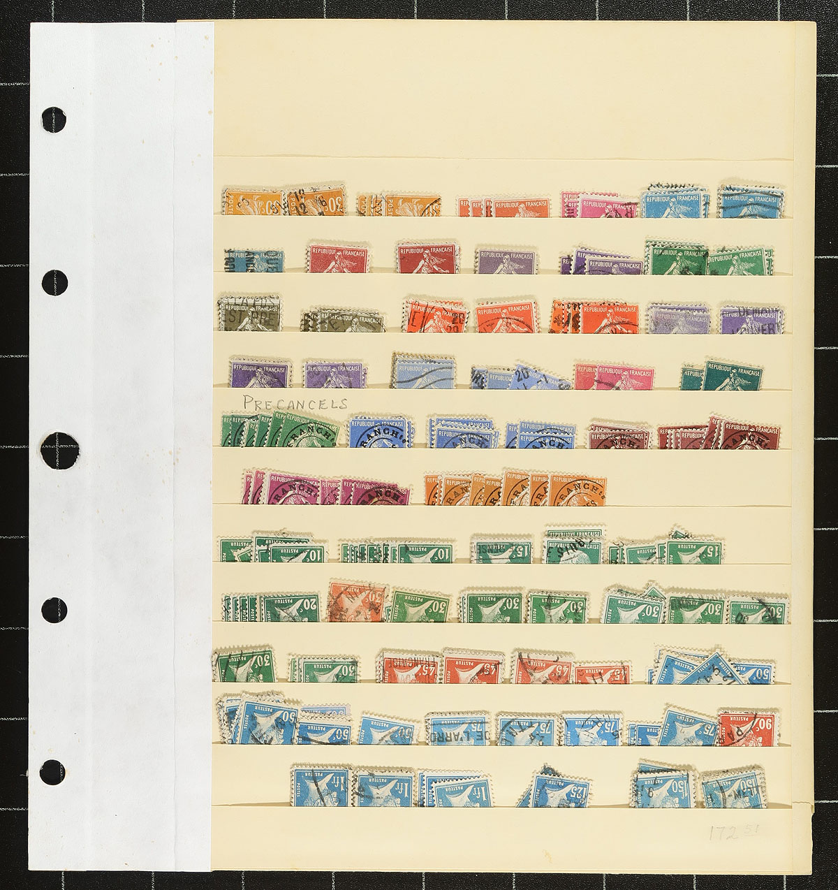 Part 3: French accumulation of used early 20th century "Liberty, Equality, Fraternity", "Rights of Man", Liberty and Peace", "Sower" and "Pasteur" issues on 6 Elbe stockpages. Wide range of denominations, and many have basic catalogue values to $20.00 each, and better values are distinctly possible. Items are often stacked five deep, meaning there is a lot more here than appears in the images. It also means we aren’t exactly sure what is here. At 100 years old, expect some mixed condition. Assembled about 60 years ago, awaiting a modern treasure seeker (the collector reused these pages, ignore the easily removable pencil notations). Estimate =