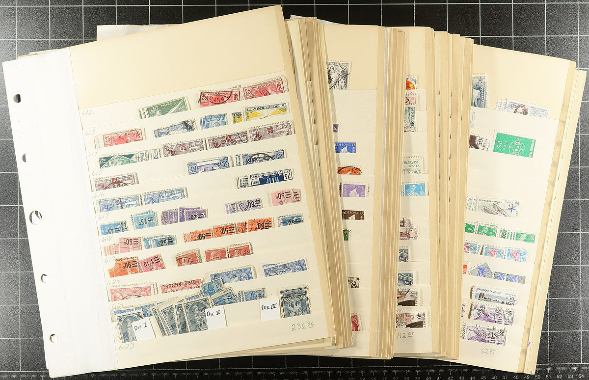 Part 4: French accumulation of used 20th century commemoratives and definitives from the Paris Olympics issue to about 1960 on 25 Elbe stockpages in a black album. Lots of great 1920's-1930's commemoratives, including some identified for die numbers, overprints, lots of nice cancels with individual stamps with catalogue values to $20.00 each. Items are often stacked 5 deep, meaning there is a lot more here than appears in the images. It also means we aren’t sure exactly what is here. Condition appears to be pretty good. Assembled about 60 years ago, awaiting a modern treasure seeker (the collector reused these pages so ignore the easily removable pencil notations). Estimate =