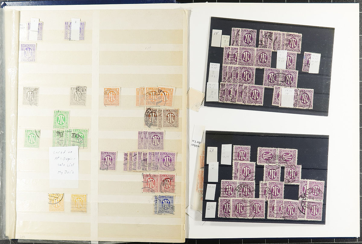 A post-war trio of specialist and more recent issues. A 32-page stockbook is crammed with "Allied Military Government" mint and used issues which someone has started a very specialized study of printing and perforation differences. This is followed by a three-ring binder that has a similar offering of 1946 issues (and more AMG material), again with the start of a deep dive into Michel. The final binder is a mostly used and very modern holding, primarily of regular issues and semi-postals (Scott numbers #1994/3252 & #B3/B1175), with issues up to 2021, giving you the opportunity to fill in many of the postally used issues from the past 20 years. Enormous catalogue value here. Estimate =