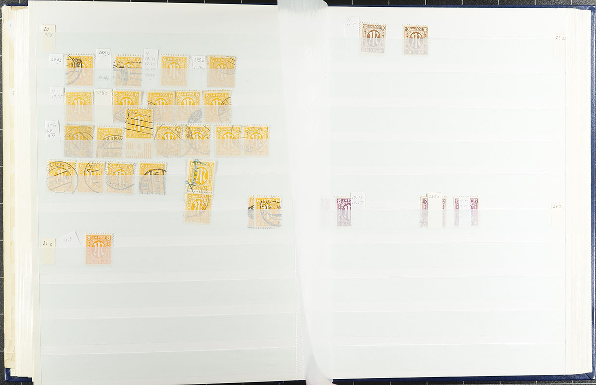 A post-war trio of specialist and more recent issues. A 32-page stockbook is crammed with "Allied Military Government" mint and used issues which someone has started a very specialized study of printing and perforation differences. This is followed by a three-ring binder that has a similar offering of 1946 issues (and more AMG material), again with the start of a deep dive into Michel. The final binder is a mostly used and very modern holding, primarily of regular issues and semi-postals (Scott numbers #1994/3252 & #B3/B1175), with issues up to 2021, giving you the opportunity to fill in many of the postally used issues from the past 20 years. Enormous catalogue value here. Estimate =