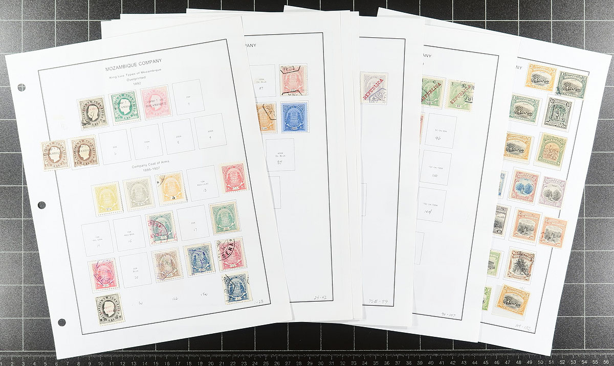 Semi-specialized collections from several colonies on computer generated pages (pre-Independence only). Cape Verde, Funchal, Horta, Inhambane, Lourenco Marques, Macau, Madeira, Mozambique Co. and Portuguese India. Most are 1870s to mid-20th century. A mix of mint and used, with some nice cancels. The collector had an appreciation of colour shades (not listed in Scott), of which there are many variants. Lots of common design material, some back of the book. A quick check indicates values to $10.00, but some better may be lurking. A couple of thousand stamps. Perfect for both beginner and specialist. Estimate =