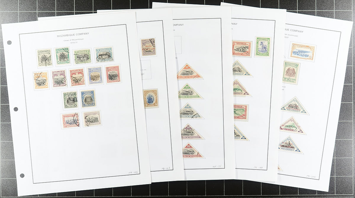 Semi-specialized collections from several colonies on computer generated pages (pre-Independence only). Cape Verde, Funchal, Horta, Inhambane, Lourenco Marques, Macau, Madeira, Mozambique Co. and Portuguese India. Most are 1870s to mid-20th century. A mix of mint and used, with some nice cancels. The collector had an appreciation of colour shades (not listed in Scott), of which there are many variants. Lots of common design material, some back of the book. A quick check indicates values to $10.00, but some better may be lurking. A couple of thousand stamps. Perfect for both beginner and specialist. Estimate =