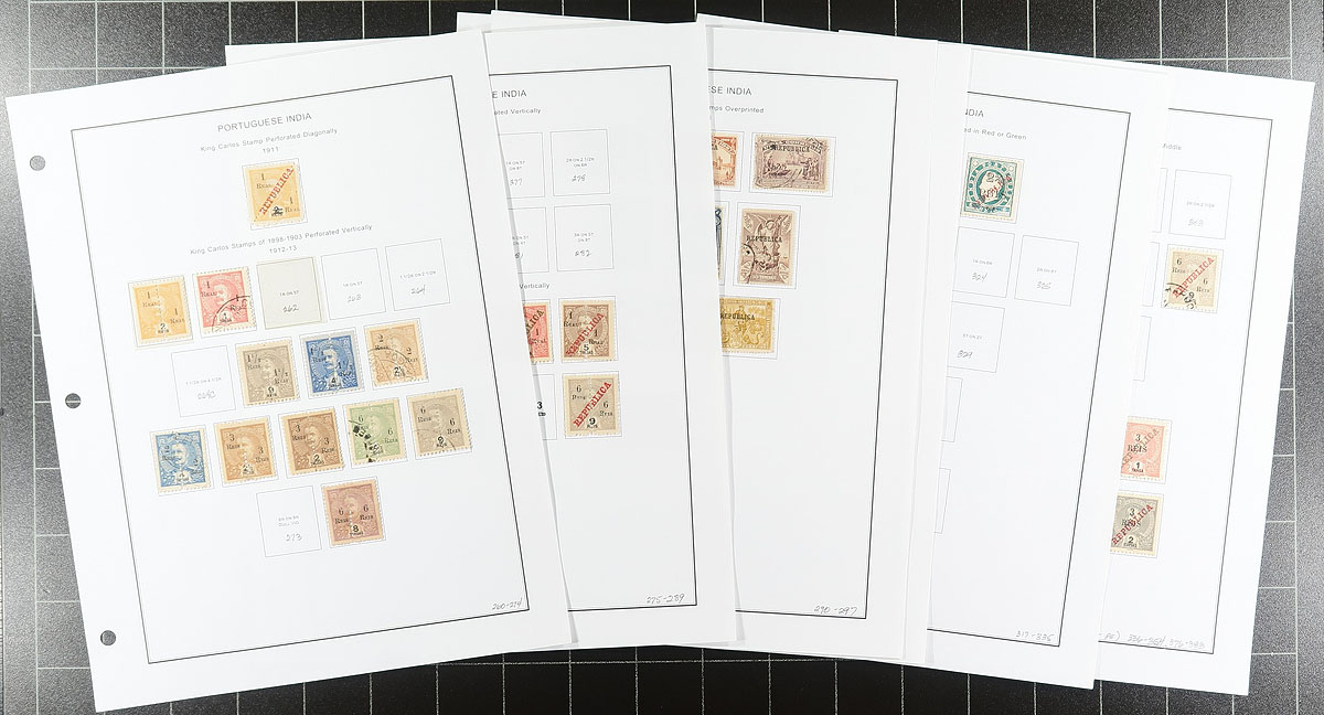 Semi-specialized collections from several colonies on computer generated pages (pre-Independence only). Cape Verde, Funchal, Horta, Inhambane, Lourenco Marques, Macau, Madeira, Mozambique Co. and Portuguese India. Most are 1870s to mid-20th century. A mix of mint and used, with some nice cancels. The collector had an appreciation of colour shades (not listed in Scott), of which there are many variants. Lots of common design material, some back of the book. A quick check indicates values to $10.00, but some better may be lurking. A couple of thousand stamps. Perfect for both beginner and specialist. Estimate =