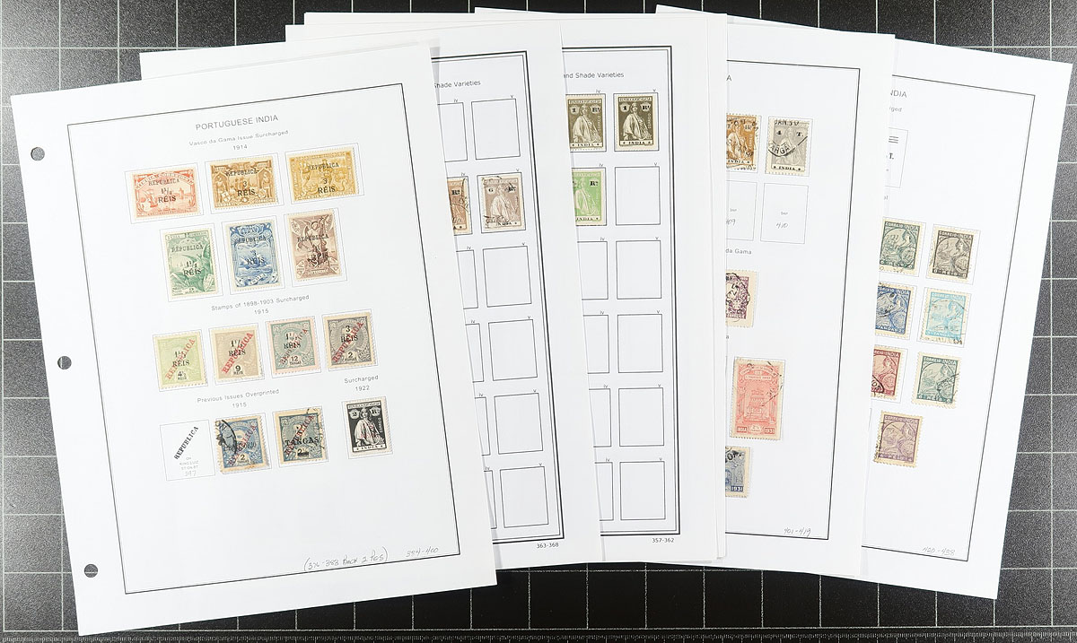 Semi-specialized collections from several colonies on computer generated pages (pre-Independence only). Cape Verde, Funchal, Horta, Inhambane, Lourenco Marques, Macau, Madeira, Mozambique Co. and Portuguese India. Most are 1870s to mid-20th century. A mix of mint and used, with some nice cancels. The collector had an appreciation of colour shades (not listed in Scott), of which there are many variants. Lots of common design material, some back of the book. A quick check indicates values to $10.00, but some better may be lurking. A couple of thousand stamps. Perfect for both beginner and specialist. Estimate =