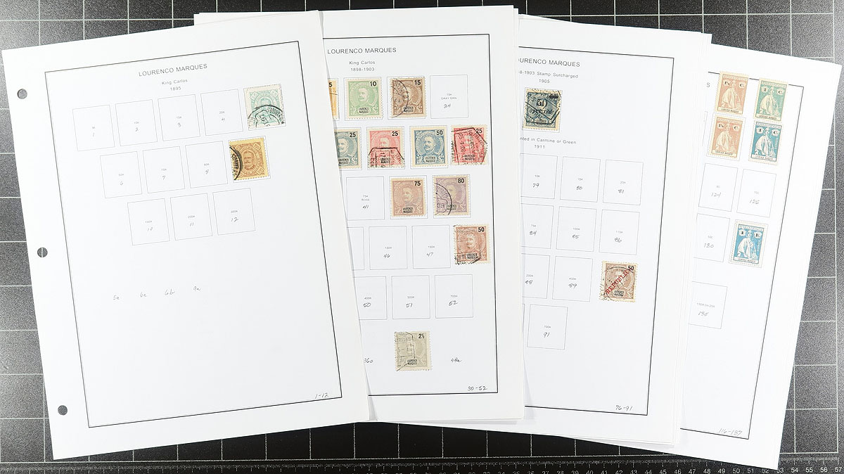 Semi-specialized collections from several colonies on computer generated pages (pre-Independence only). Cape Verde, Funchal, Horta, Inhambane, Lourenco Marques, Macau, Madeira, Mozambique Co. and Portuguese India. Most are 1870s to mid-20th century. A mix of mint and used, with some nice cancels. The collector had an appreciation of colour shades (not listed in Scott), of which there are many variants. Lots of common design material, some back of the book. A quick check indicates values to $10.00, but some better may be lurking. A couple of thousand stamps. Perfect for both beginner and specialist. Estimate =