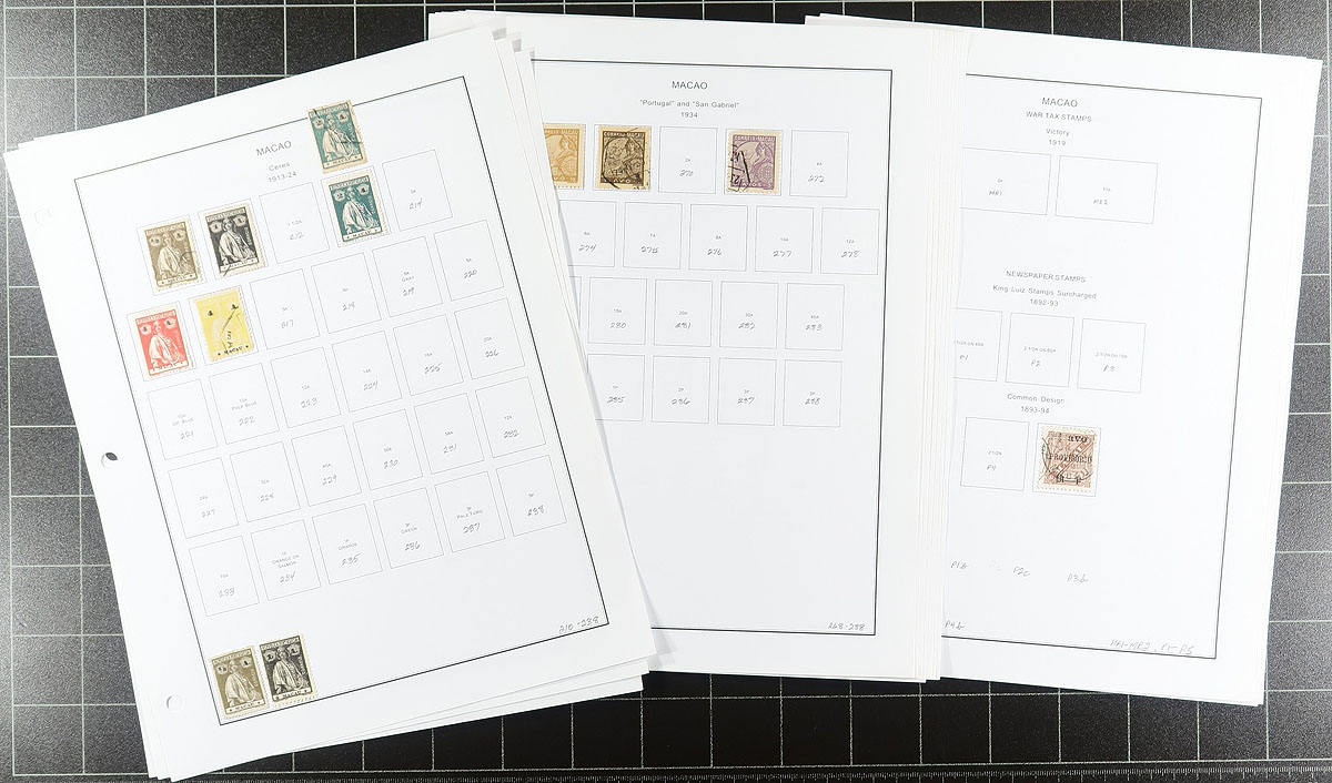 Semi-specialized collections from several colonies on computer generated pages (pre-Independence only). Cape Verde, Funchal, Horta, Inhambane, Lourenco Marques, Macau, Madeira, Mozambique Co. and Portuguese India. Most are 1870s to mid-20th century. A mix of mint and used, with some nice cancels. The collector had an appreciation of colour shades (not listed in Scott), of which there are many variants. Lots of common design material, some back of the book. A quick check indicates values to $10.00, but some better may be lurking. A couple of thousand stamps. Perfect for both beginner and specialist. Estimate =