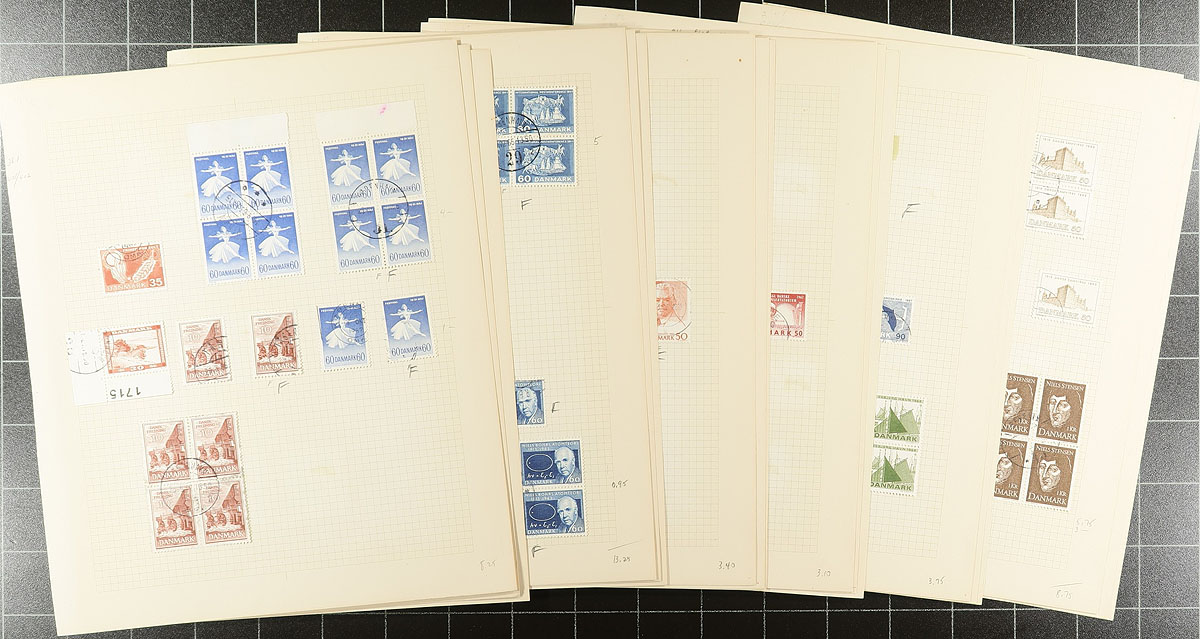 Three part holding of used, 20th century material, including some good back of the book. Starts with a used mounted collection of 1963-1988 with a nice selection of blocks of four. The second part is a small group of pages cut from stockbooks (1950-1990-ish) with lots of nice cancels here. The last group is a mounted collection of regular issues (1947-1975) and "back of the book" (best are the postage dues and officials) on quadrilled Lighthouse pages. Several hundred dollars of catalogue value here. Estimate =