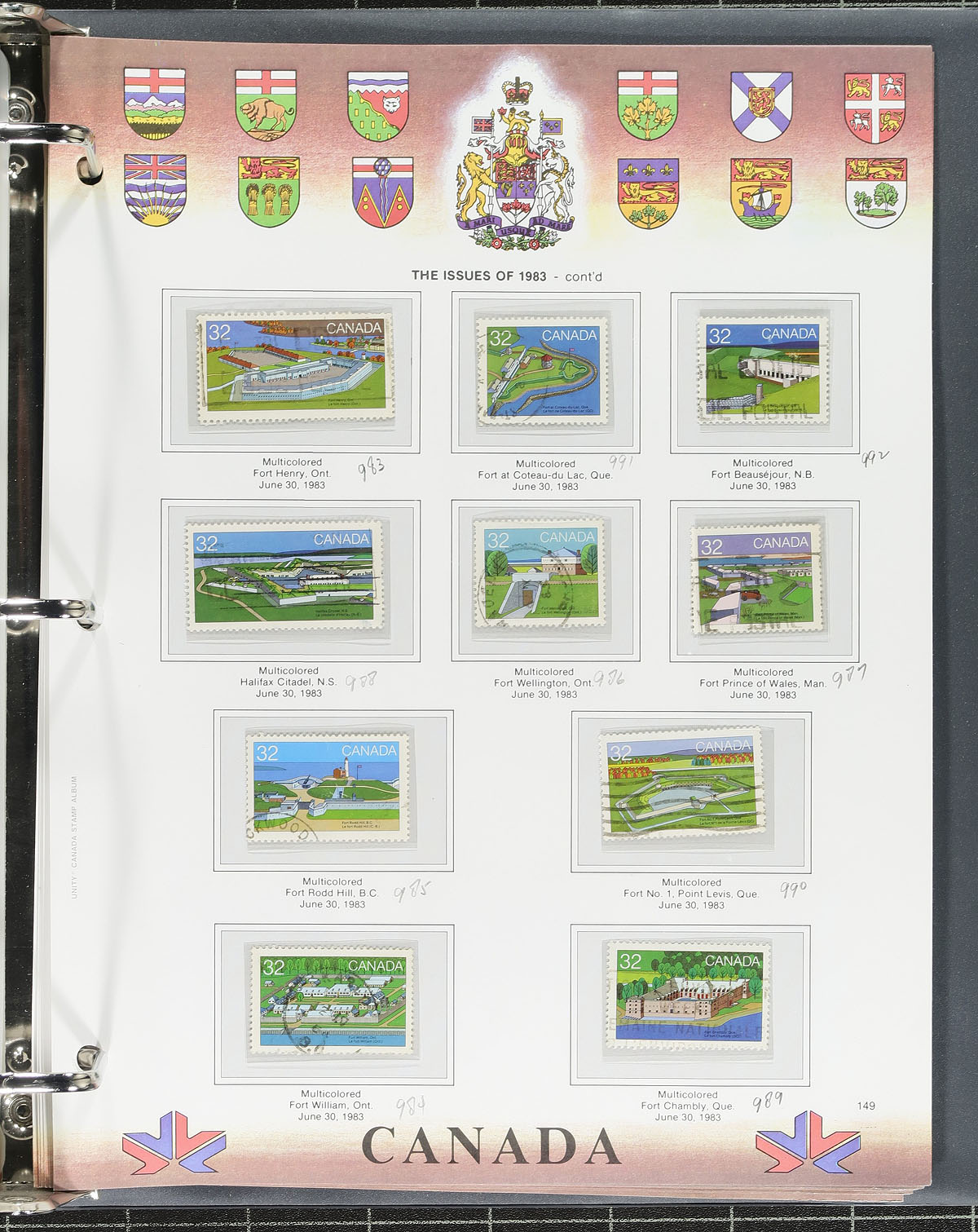 Very complete, used, collection of regular issues in three volumes, starting with a complete 1908 Quebec Tercentenary in 2011. Mostly complete KGV and KGVI sets including "Scroll" (with Bluenose), Arch, and the later dollar values. The Queen Elizabeth section is very complete, including many souvenir sheets (a few souvenir sheets are mint as "place holders"). The last few years are a bit sparser, the coils are generally singles and there are no booklets (but some booklet singles). Condition is generally good, with some nice cancels noted. You won’t need much to "complete" this century long collection. Estimate =