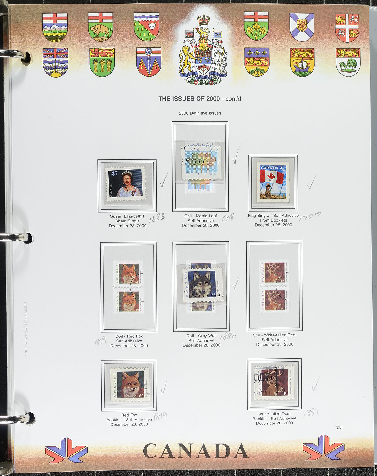 Very complete, used, collection of regular issues in three volumes, starting with a complete 1908 Quebec Tercentenary in 2011. Mostly complete KGV and KGVI sets including "Scroll" (with Bluenose), Arch, and the later dollar values. The Queen Elizabeth section is very complete, including many souvenir sheets (a few souvenir sheets are mint as "place holders"). The last few years are a bit sparser, the coils are generally singles and there are no booklets (but some booklet singles). Condition is generally good, with some nice cancels noted. You won’t need much to "complete" this century long collection. Estimate =