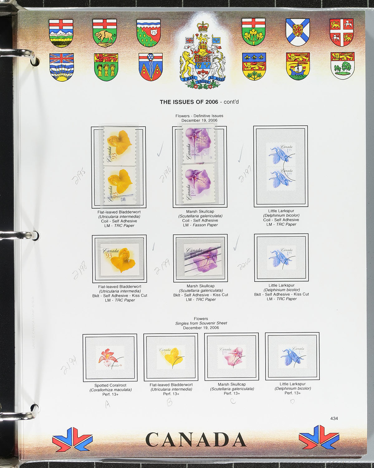 Very complete, used, collection of regular issues in three volumes, starting with a complete 1908 Quebec Tercentenary in 2011. Mostly complete KGV and KGVI sets including "Scroll" (with Bluenose), Arch, and the later dollar values. The Queen Elizabeth section is very complete, including many souvenir sheets (a few souvenir sheets are mint as "place holders"). The last few years are a bit sparser, the coils are generally singles and there are no booklets (but some booklet singles). Condition is generally good, with some nice cancels noted. You won’t need much to "complete" this century long collection. Estimate =