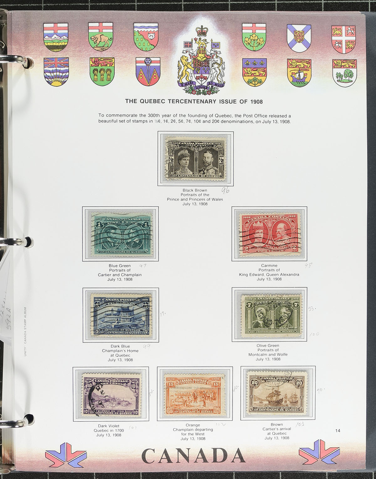Very complete, used, collection of regular issues in three volumes, starting with a complete 1908 Quebec Tercentenary in 2011. Mostly complete KGV and KGVI sets including "Scroll" (with Bluenose), Arch, and the later dollar values. The Queen Elizabeth section is very complete, including many souvenir sheets (a few souvenir sheets are mint as "place holders"). The last few years are a bit sparser, the coils are generally singles and there are no booklets (but some booklet singles). Condition is generally good, with some nice cancels noted. You won’t need much to "complete" this century long collection. Estimate =