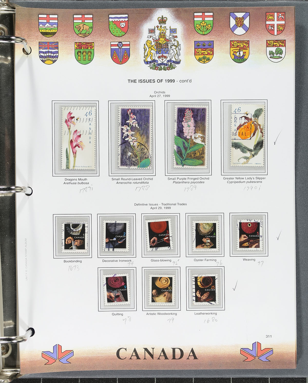 Very complete, used, collection of regular issues in three volumes, starting with a complete 1908 Quebec Tercentenary in 2011. Mostly complete KGV and KGVI sets including "Scroll" (with Bluenose), Arch, and the later dollar values. The Queen Elizabeth section is very complete, including many souvenir sheets (a few souvenir sheets are mint as "place holders"). The last few years are a bit sparser, the coils are generally singles and there are no booklets (but some booklet singles). Condition is generally good, with some nice cancels noted. You won’t need much to "complete" this century long collection. Estimate =