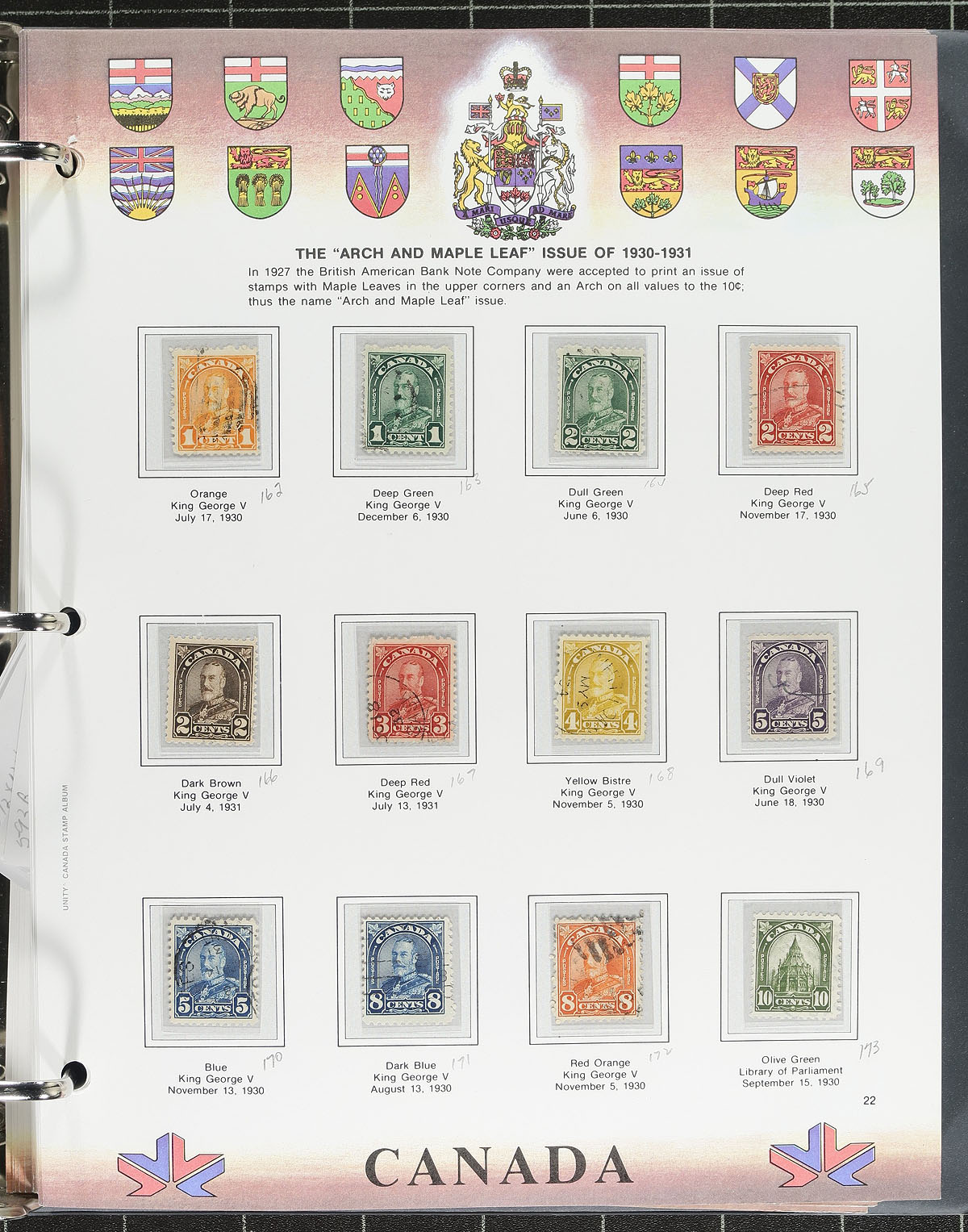 Very complete, used, collection of regular issues in three volumes, starting with a complete 1908 Quebec Tercentenary in 2011. Mostly complete KGV and KGVI sets including "Scroll" (with Bluenose), Arch, and the later dollar values. The Queen Elizabeth section is very complete, including many souvenir sheets (a few souvenir sheets are mint as "place holders"). The last few years are a bit sparser, the coils are generally singles and there are no booklets (but some booklet singles). Condition is generally good, with some nice cancels noted. You won’t need much to "complete" this century long collection. Estimate =