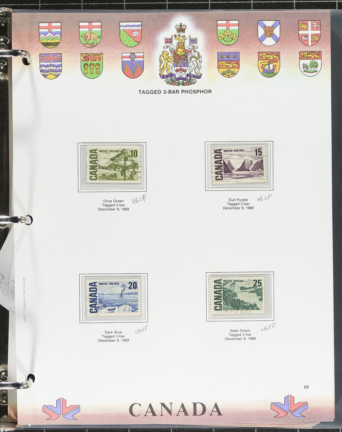 Very complete, used, collection of regular issues in three volumes, starting with a complete 1908 Quebec Tercentenary in 2011. Mostly complete KGV and KGVI sets including "Scroll" (with Bluenose), Arch, and the later dollar values. The Queen Elizabeth section is very complete, including many souvenir sheets (a few souvenir sheets are mint as "place holders"). The last few years are a bit sparser, the coils are generally singles and there are no booklets (but some booklet singles). Condition is generally good, with some nice cancels noted. You won’t need much to "complete" this century long collection. Estimate =
