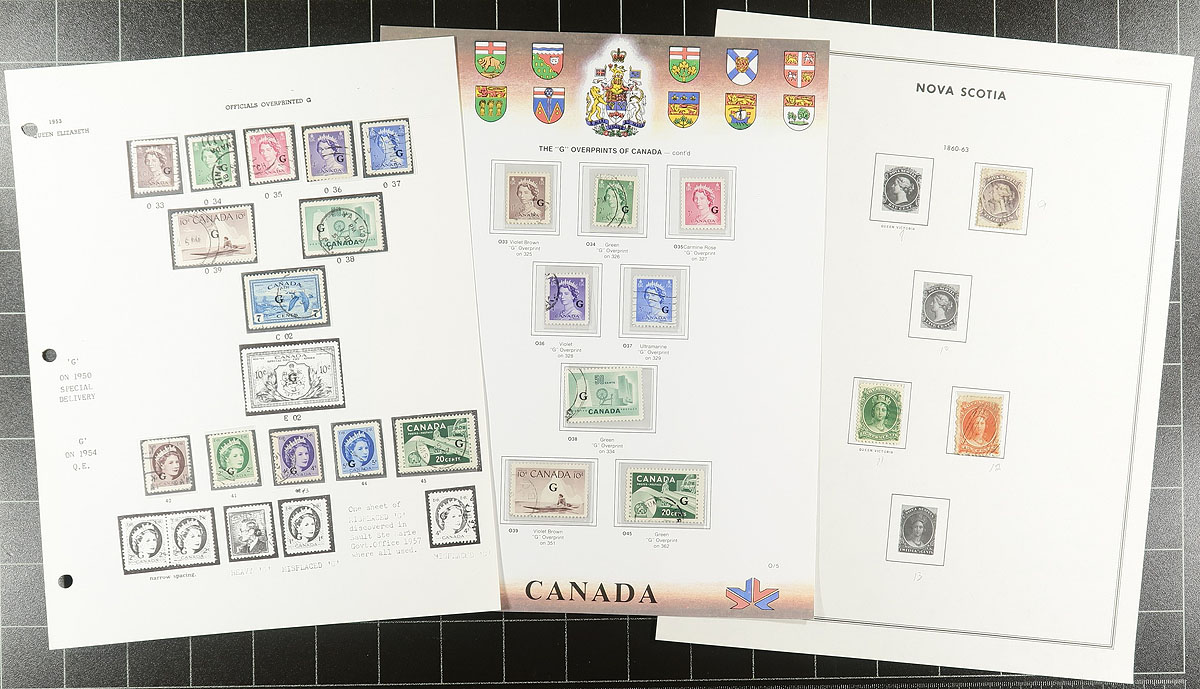 A used, and quite complete, collection of used "back of the book" Canada, plus a stamp or two from the three Maritime colonies, plus a collection of about 100 different Newfoundland stamps. Most are clean examples with respectable cancels. Includes all the Montreal Olympic semi-postals, and an example of each of the airmail and special delivery issues. The Registration trio is there, including the 8c #F3, and a basic offering of both purple and red postage dues. The Officials include a light offering of 4-hole OHMS, and a hit-or-miss group of "OHMS" and "G" overprints (did see the $ Peace and $ Fisheries with "G" overprints). Lots of catalogue value here. Estimate =